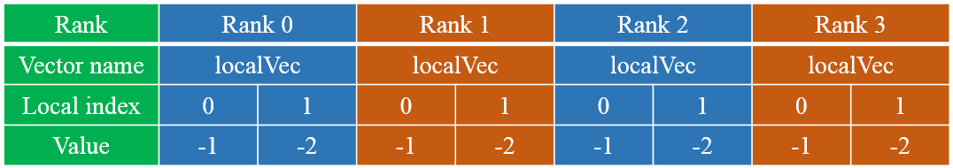 In the sample code a global vector x of length 16 is created across 4 processors (ranks). The content of the original x is illustrated in the following figure.