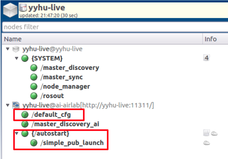 In this launch file, we enable the autostart function and tells defualt_cfg the information of the node to launch. Then we could launch default_cfg as usual with a “screen”.